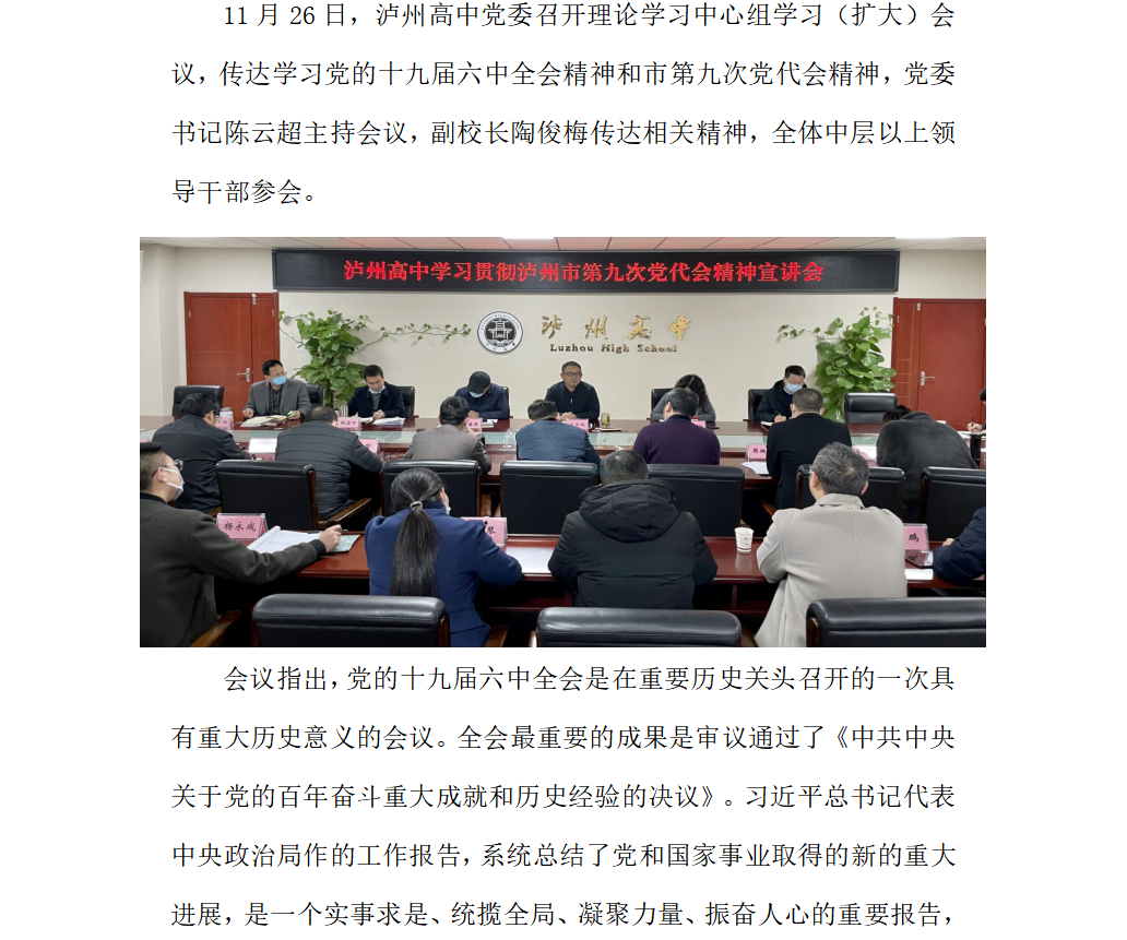 瀘州高中黨委召開理論學(xué)習(xí)中心組學(xué)習(xí)(擴(kuò)大)會議深入貫徹學(xué)習(xí)黨的十九屆六中全會精神和市第九次黨代會精神