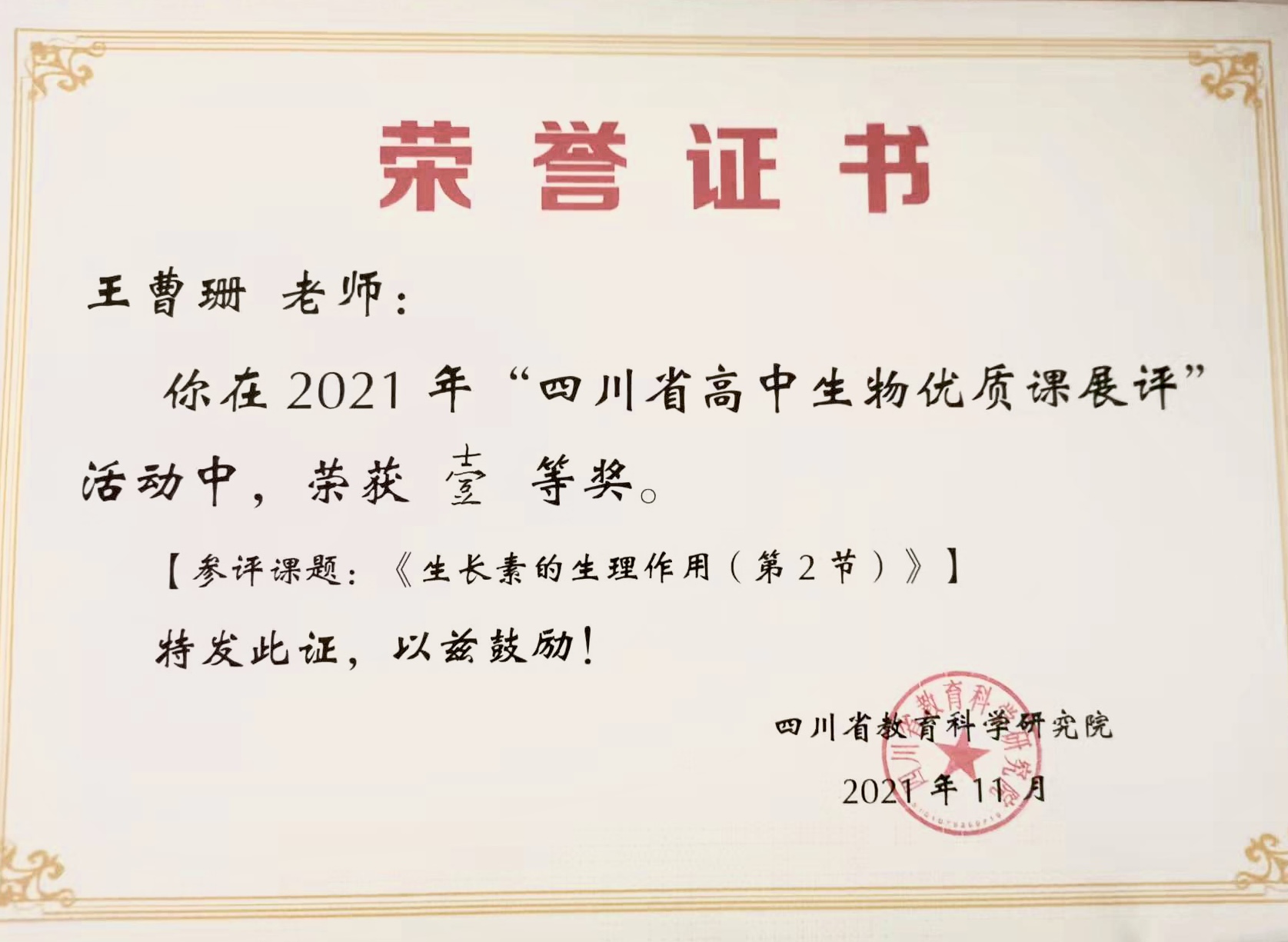 2021年12月16日,四川省普通高中生物優(yōu)質(zhì)課大賽圓滿落幕,瀘州高中王曹珊老師榮獲一等獎。本次大賽是四川省教育科學研究院舉辦的四川省中學生物課規(guī)格最高、最權威且最專業(yè)的優(yōu)質(zhì)課比賽。王曹珊老師憑借優(yōu)秀的專業(yè)素養(yǎng)、對教材精準的解讀以及獨具匠心的教學設計,從眾多參賽選手中脫穎而出。