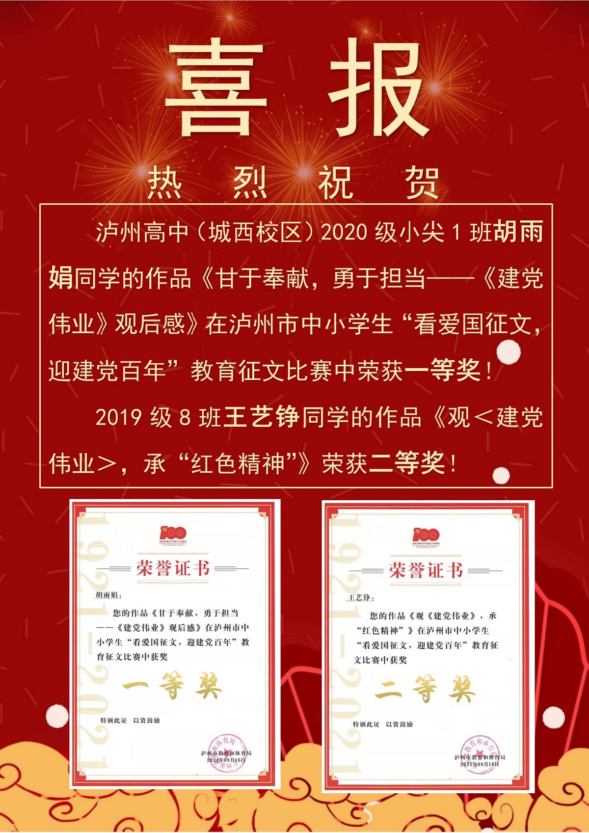 喜報(bào)--熱烈祝賀瀘高學(xué)子在瀘州市中小學(xué)生“看愛(ài)國(guó)征文,迎建黨百年”教育征文比賽中榮獲一、二等獎(jiǎng)