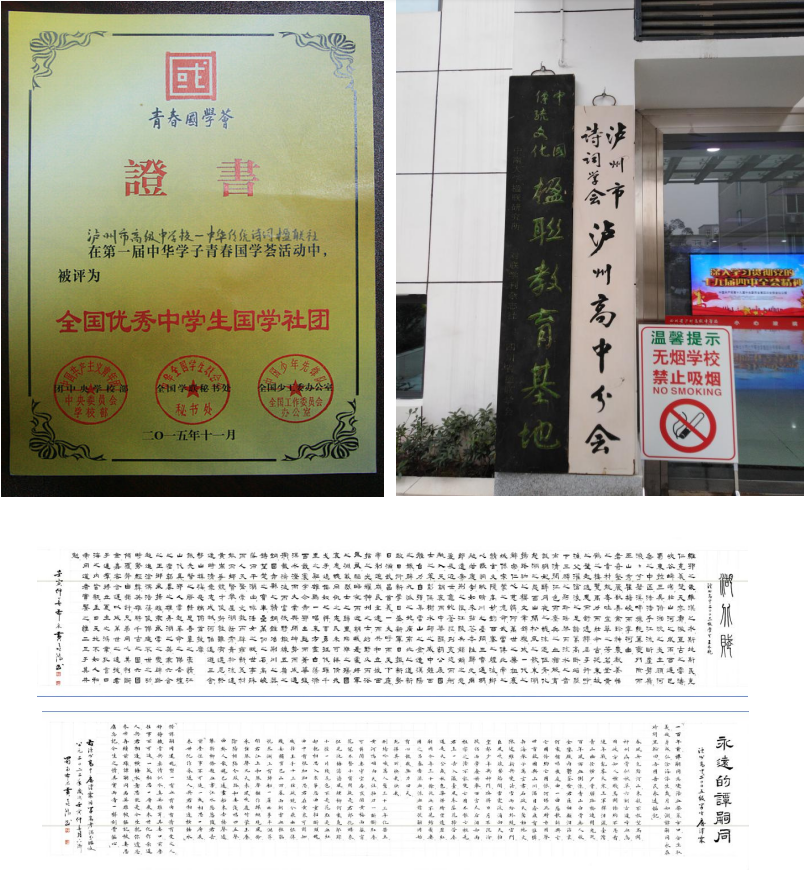 瀘州高中詩(shī)詞楹聯(lián)教育成績(jī)蜚聲國(guó)內(nèi),被評(píng)為全國(guó)詩(shī)詞楹聯(lián)教育基地,詩(shī)詞楹聯(lián)社獲全國(guó)優(yōu)秀中學(xué)生國(guó)學(xué)社團(tuán)稱(chēng)號(hào),王林晚同學(xué)應(yīng)邀為湖北省寫(xiě)賦,唐漢霖同學(xué)的古體詩(shī)《永遠(yuǎn)的譚嗣同》獲四川省高考滿(mǎn)分作文,吟詩(shī)作對(duì)成為了許多瀘高學(xué)子終生的愛(ài)好。