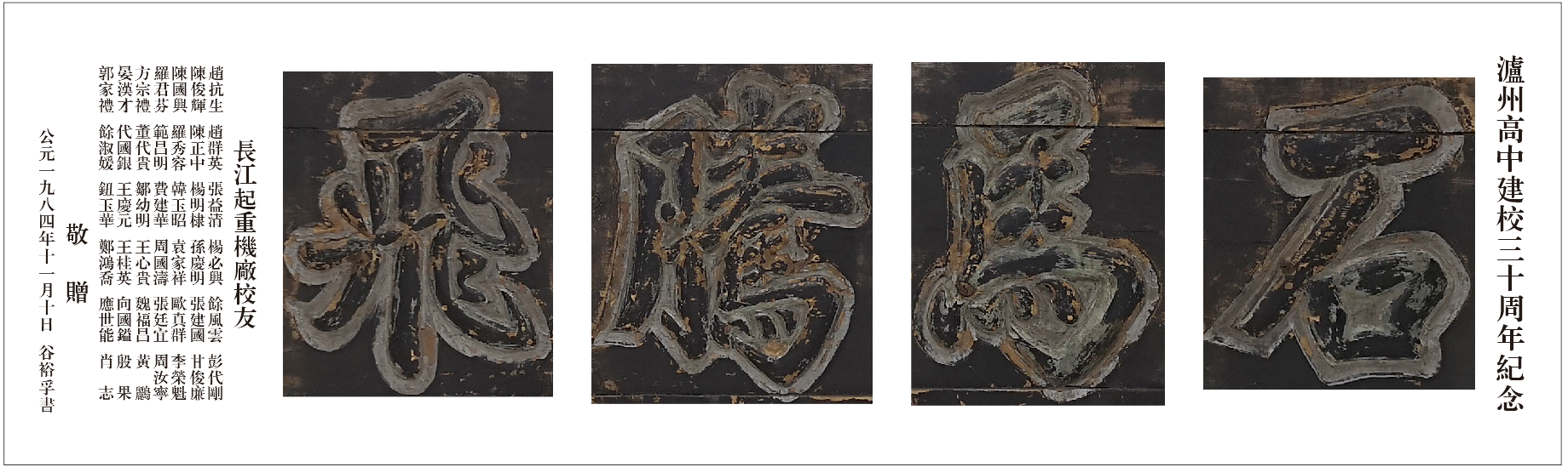 在校工作30余年的校紀(jì)委書(shū)記羅德強(qiáng)介紹,1984年瀘州高中三十周年校慶之際,瀘州長(zhǎng)江起重機(jī)廠(chǎng)幾十名校友聯(lián)名邀請(qǐng)時(shí)任校長(zhǎng)谷裕孚親筆題寫(xiě)“石馬騰飛”四個(gè)蒼勁大字,并制作成匾額贈(zèng)送給母校。