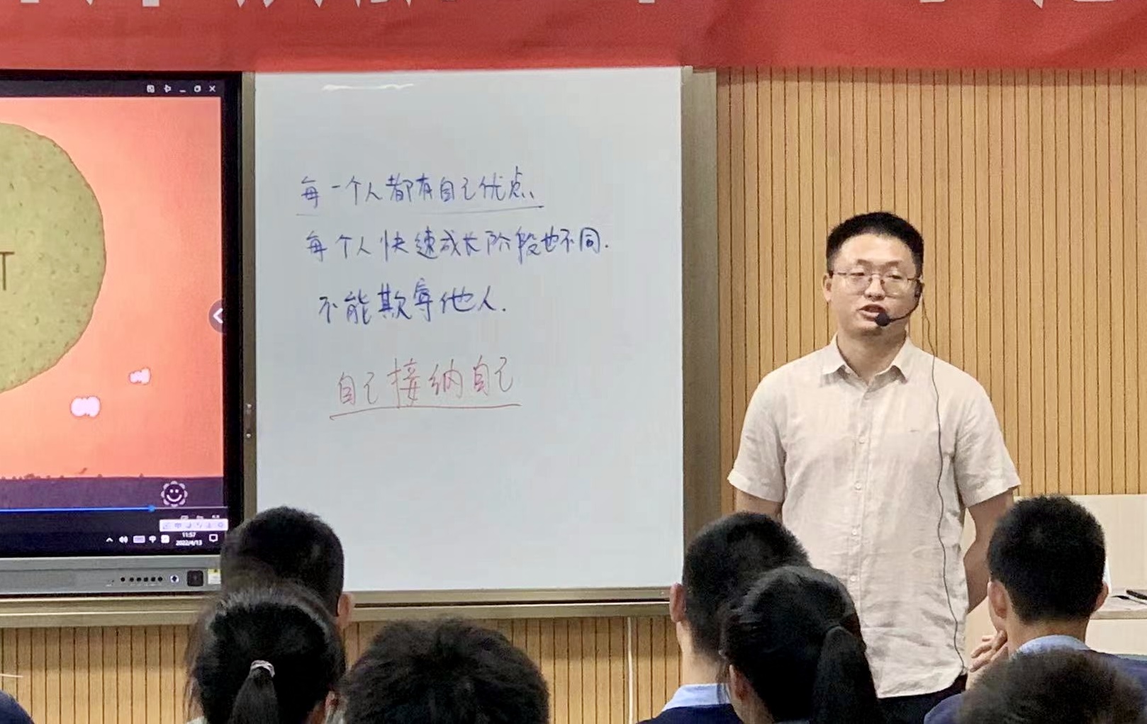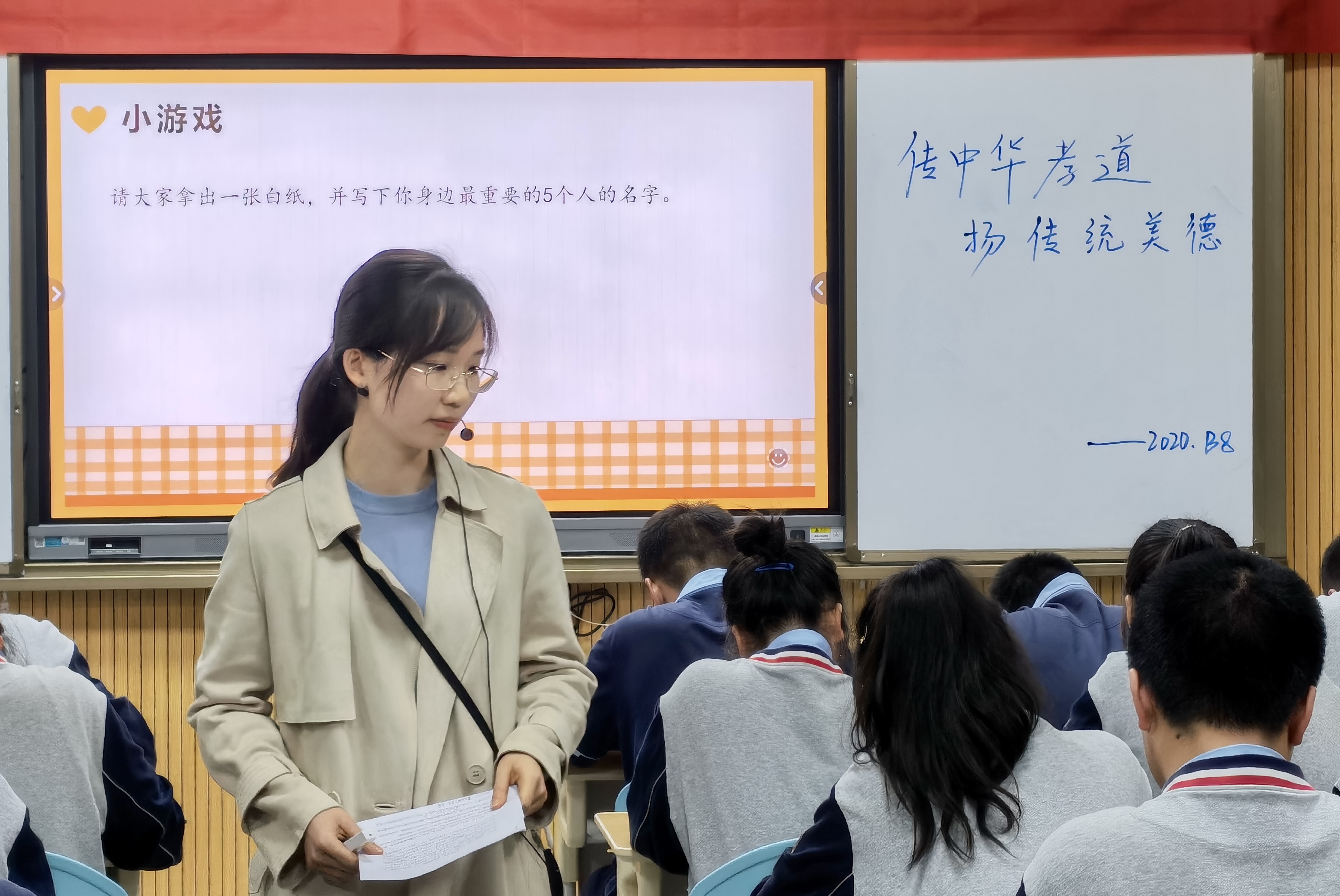 熊曉宇老師以“傳中華孝道,揚傳統(tǒng)美德”為題,通過情景劇、課堂討論,探討了親自沖突產(chǎn)生的原因;通過分享真實故事,觀看家長寄語,現(xiàn)場測試,引導學生走入父母內心世界;通過書寫心里話和“青春承諾”,引領學生表達了孝老愛親之情,班會感人至深,令人嘆為觀止。