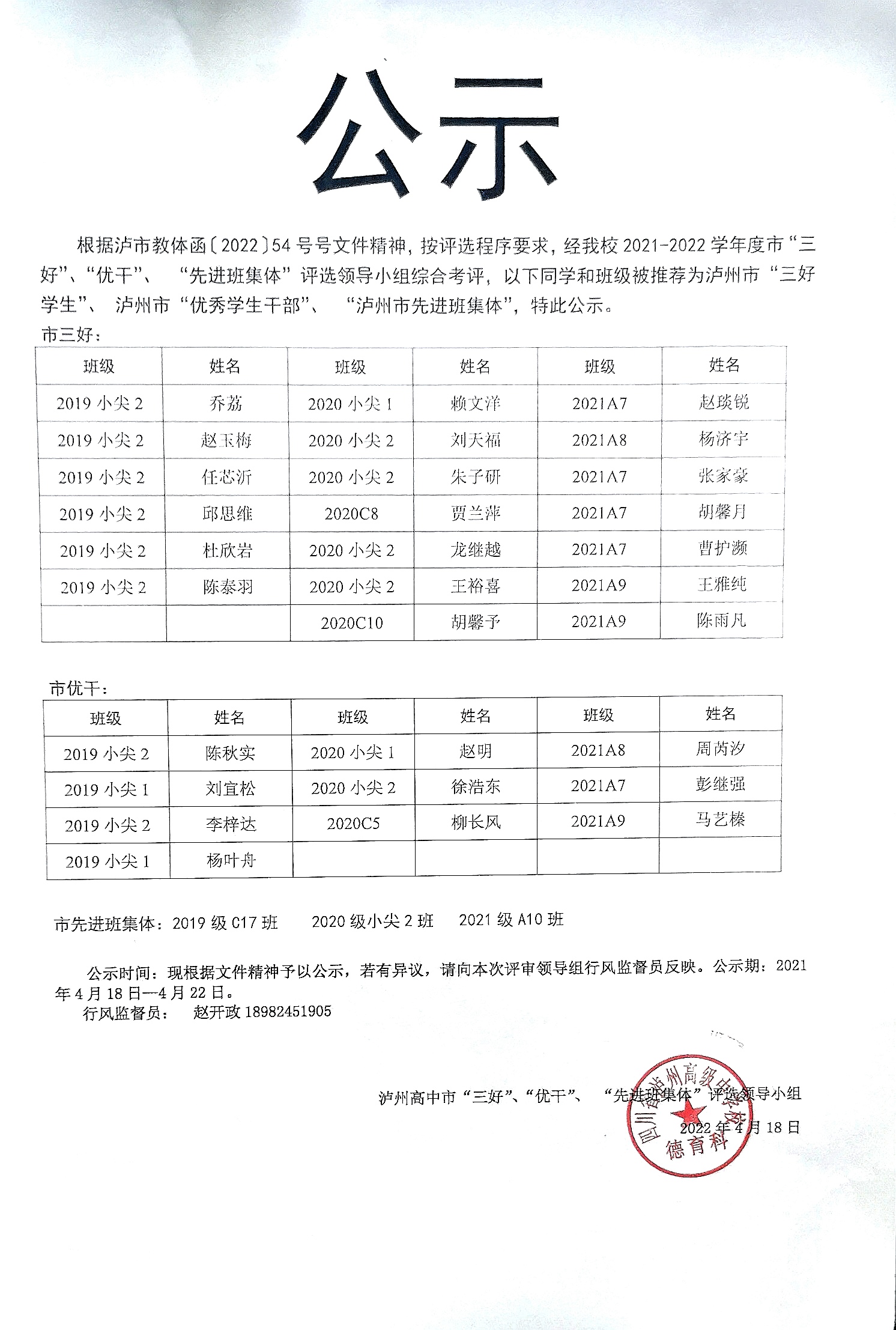 瀘州高中關于2021-2022學年度市“三好”、“優(yōu)干”、 “先進班集體”的公示