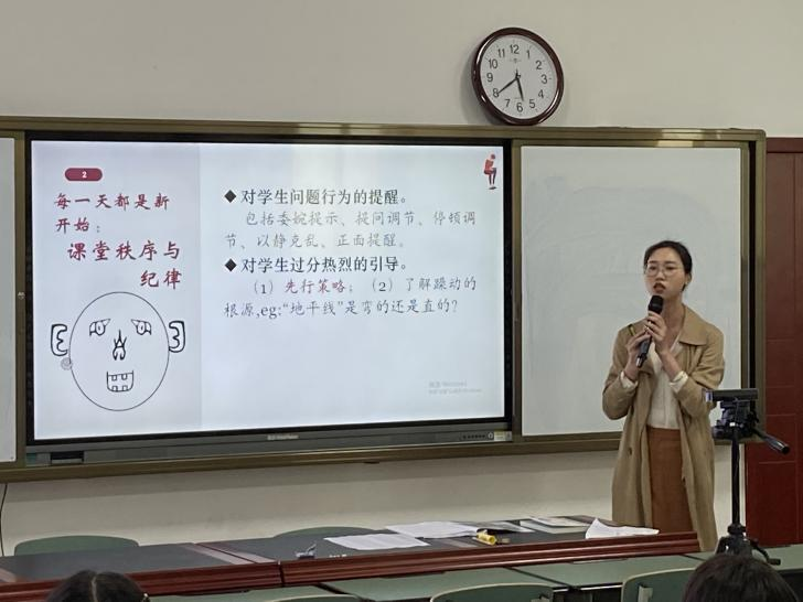 本次會(huì)議有新教師讀書分享、學(xué)校領(lǐng)導(dǎo)培訓(xùn)、近期活動(dòng)通報(bào)安排三項(xiàng)議程。 首先由2021級(jí)新分教師董靜怡分享《你的第一年(新教師如何生存發(fā)展)》這本書的讀后感。董老師主要從課堂管理這個(gè)角度進(jìn)行了分享,其中結(jié)合自身的教學(xué)方式方法和教學(xué)實(shí)例幽默的給大家分享了課堂規(guī)則、課堂紀(jì)律、師生關(guān)系、課堂時(shí)間管理和教學(xué)內(nèi)容管理五個(gè)維度,讓大家感悟頗深。