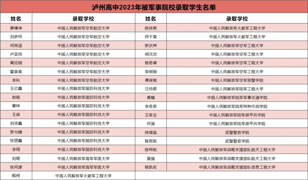 今年,瀘州高中有35名優(yōu)秀畢業(yè)生被軍隊(duì)院校錄取,創(chuàng)歷史新高。8人被國(guó)防科技大學(xué)錄取,其中,王億鑫同學(xué)高考總分689。7人入選空軍飛行員,其中,廖博坤同學(xué)高考成績(jī)670分,在空飛序列高考成績(jī)排名中居全國(guó)第三,四川第一,學(xué)校成為西南地區(qū)(航校除外)空飛錄取學(xué)生最多的學(xué)校。