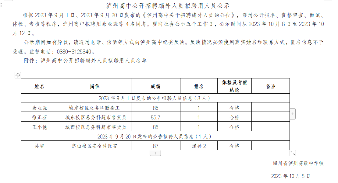 瀘州高中公開招聘編外人員擬聘用人員公示