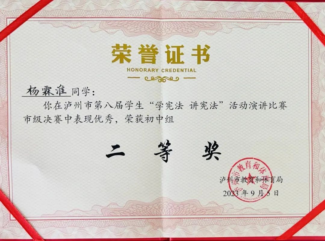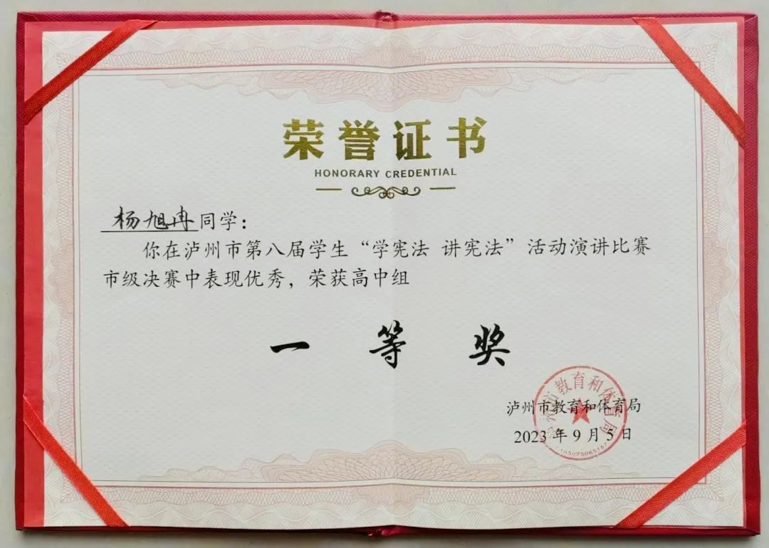 瀘州高中楊旭冉同學(xué)成功斬獲瀘州市第八屆學(xué)生“學(xué)憲法 講憲法”演講比賽市級(jí)決賽(高中組)一等獎(jiǎng)第一名。