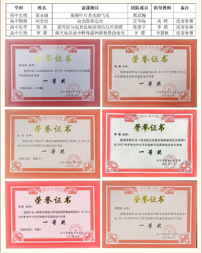 在2023年四川省中小學(xué)實(shí)驗(yàn)教學(xué)說課活動(dòng)中,瀘州高中獲得省級(jí)獎(jiǎng)項(xiàng)3個(gè)、市級(jí)獎(jiǎng)項(xiàng)8個(gè),在全市中小學(xué)中繼續(xù)領(lǐng)先水平,且穩(wěn)中有升!