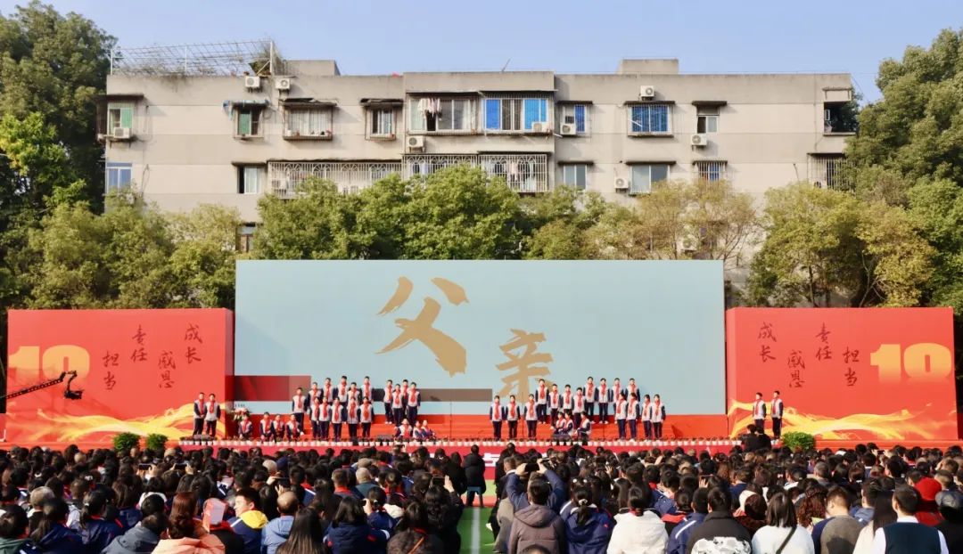 同學(xué)們與父母挽手并肩跨入“成人門”,父愛堅毅,母愛柔情。