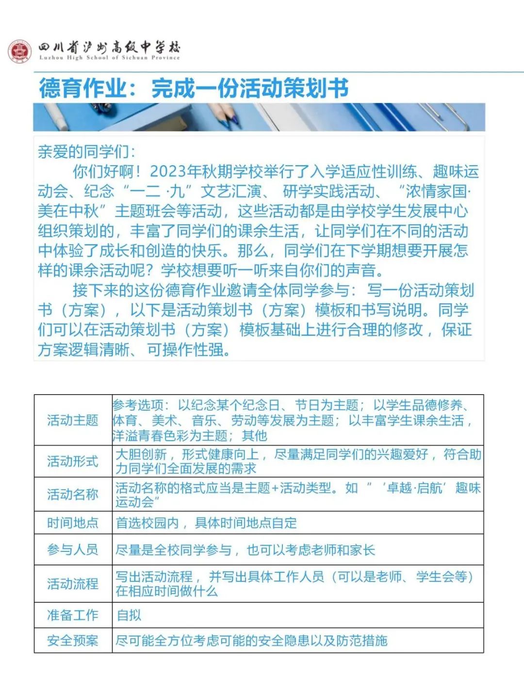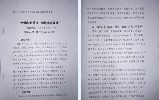 新的時(shí)代呼喚新型人才,新型人才需要?jiǎng)?chuàng)新能力。為更好回應(yīng)時(shí)代之需、人才之需,不斷增強(qiáng)學(xué)校德育工作的時(shí)代性、科學(xué)性和實(shí)效性,更好地落實(shí)立德樹人根本任務(wù),2024年寒假,瀘州高中初中部學(xué)生發(fā)展中心為同學(xué)們?cè)O(shè)計(jì)了一份特別的寒假德育作業(yè)——制作一份校園活動(dòng)策劃書。