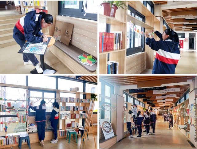 靜謐的閱讀空間經(jīng)過孩子們的巧手裝扮,煥發(fā)著濃烈的藝術(shù)氣息。走進(jìn)走廊書吧,那制作精巧的手工作品,造型各異的花燈,青翠欲滴的綠植,古樸典型的書畫,使人仿佛置身古典詩(shī)詞的世界。孩子們用慧心點(diǎn)染一方天地,點(diǎn)亮藝術(shù)空間。