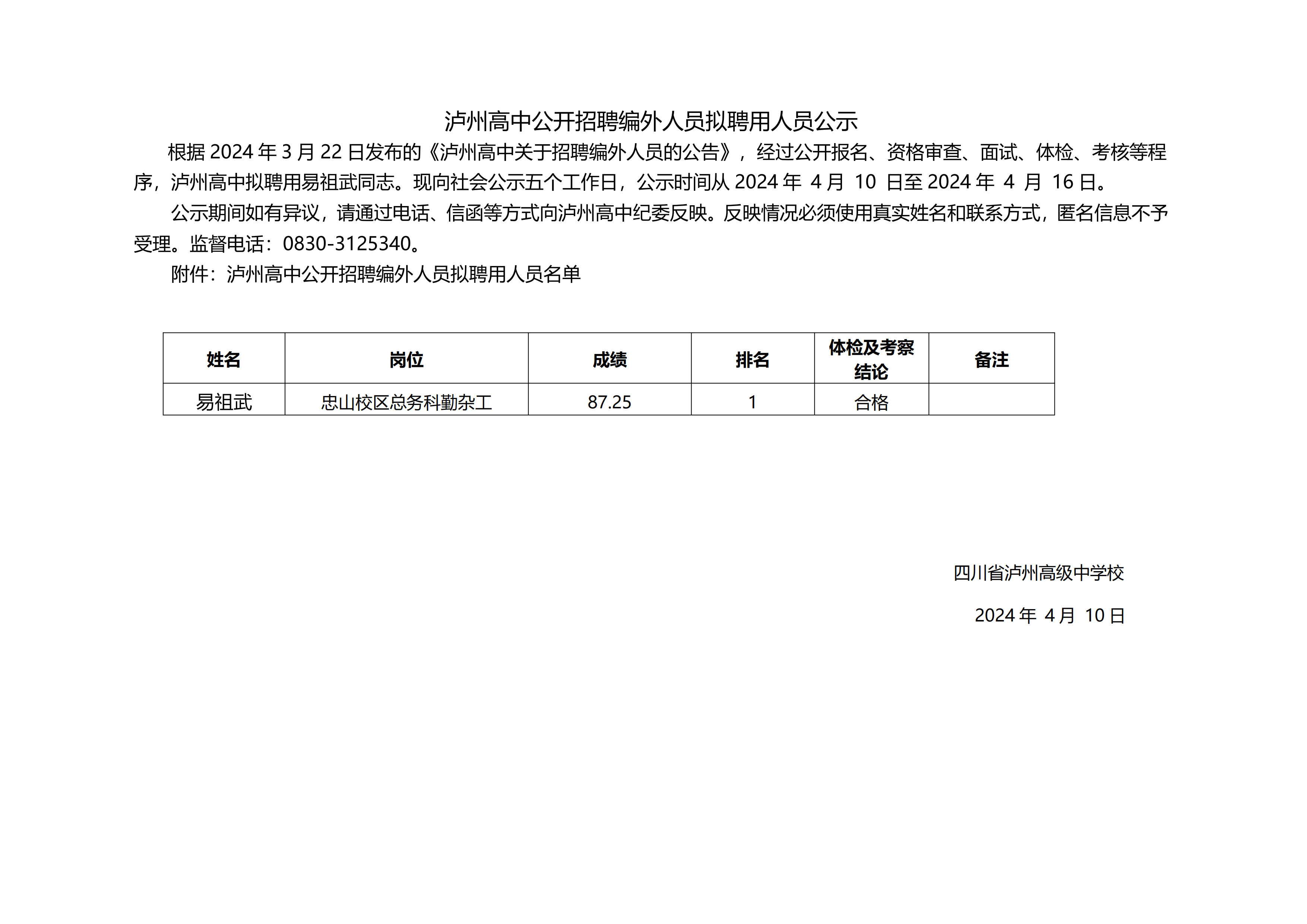 瀘州高中公開招聘編外人員擬聘用人員公示