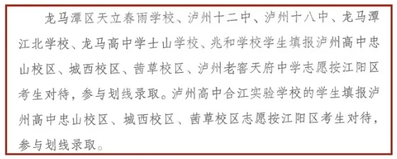 二、全市各初中學?忌蓤罂紴o州高中,各學?忌磪^(qū)縣劃線錄取。其中,龍馬潭區(qū)天立春雨學校、瀘州十二中、瀘州十八中、龍馬潭江北學校、龍馬高中學士山學校、兆和學校,以及瀘州高中合江實驗學校的考生填報瀘州高中忠山校區(qū)、城西校區(qū)、茜草校區(qū)志愿按江陽區(qū)考生對待,參與劃線錄取。
