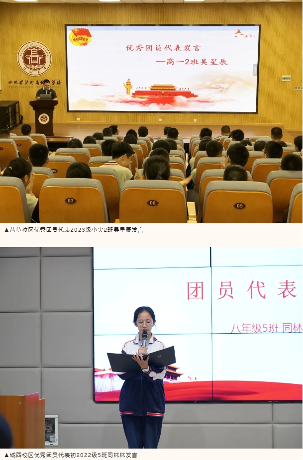 瀘州高中茜草校區(qū)高2023級(jí)吳星辰、穆穎璨,忠山校區(qū)高2022級(jí)肖周奕辰以及初2022級(jí)同林林作為團(tuán)員代表發(fā)言。同學(xué)們?cè)诎l(fā)言中表示,入團(tuán)不只是形式,團(tuán)徽也不只是標(biāo)志,應(yīng)該成為自己在學(xué)習(xí)和工作中的動(dòng)力;在團(tuán)組織的領(lǐng)導(dǎo)下,團(tuán)員們要腳踏實(shí)地、虛心學(xué)習(xí)、不斷進(jìn)取,真正從思想上加入到團(tuán)組織中去,不斷完善自我,緊密擁護(hù)團(tuán)組織,讓團(tuán)歌唱得更嘹亮,讓團(tuán)徽更加熠熠閃光。