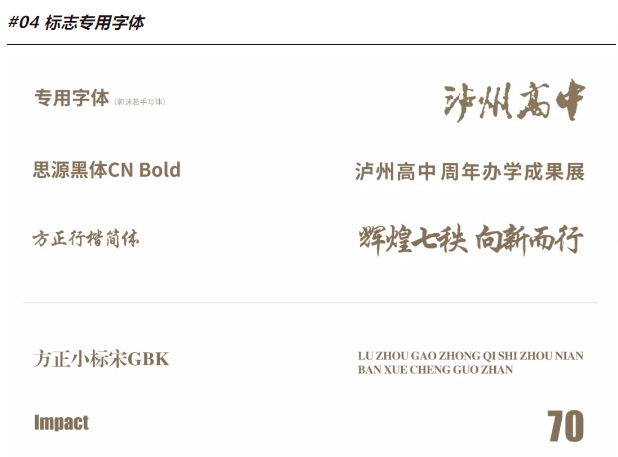 標(biāo)志以校園跑道作為重要的創(chuàng)意元素,它不僅是校園的象征,還承載了教育的使命,瀘州高中旨在為每一位學(xué)子鋪設(shè)夢想的跑道,從這里出發(fā),走向更寬廣的人生之路;同時,三條“環(huán)形跑道”也寓意了瀘州高中從1954至2024這七十年所走過的三個時代(老瀘高時代、六中時代、新瀘高時代);標(biāo)志整體以數(shù)字“70”輔以郭沫若題字“瀘州高中”及70周年辦學(xué)成果展字樣,展示了瀘州高中在教育領(lǐng)域奮力扎根的七十載歲月。
