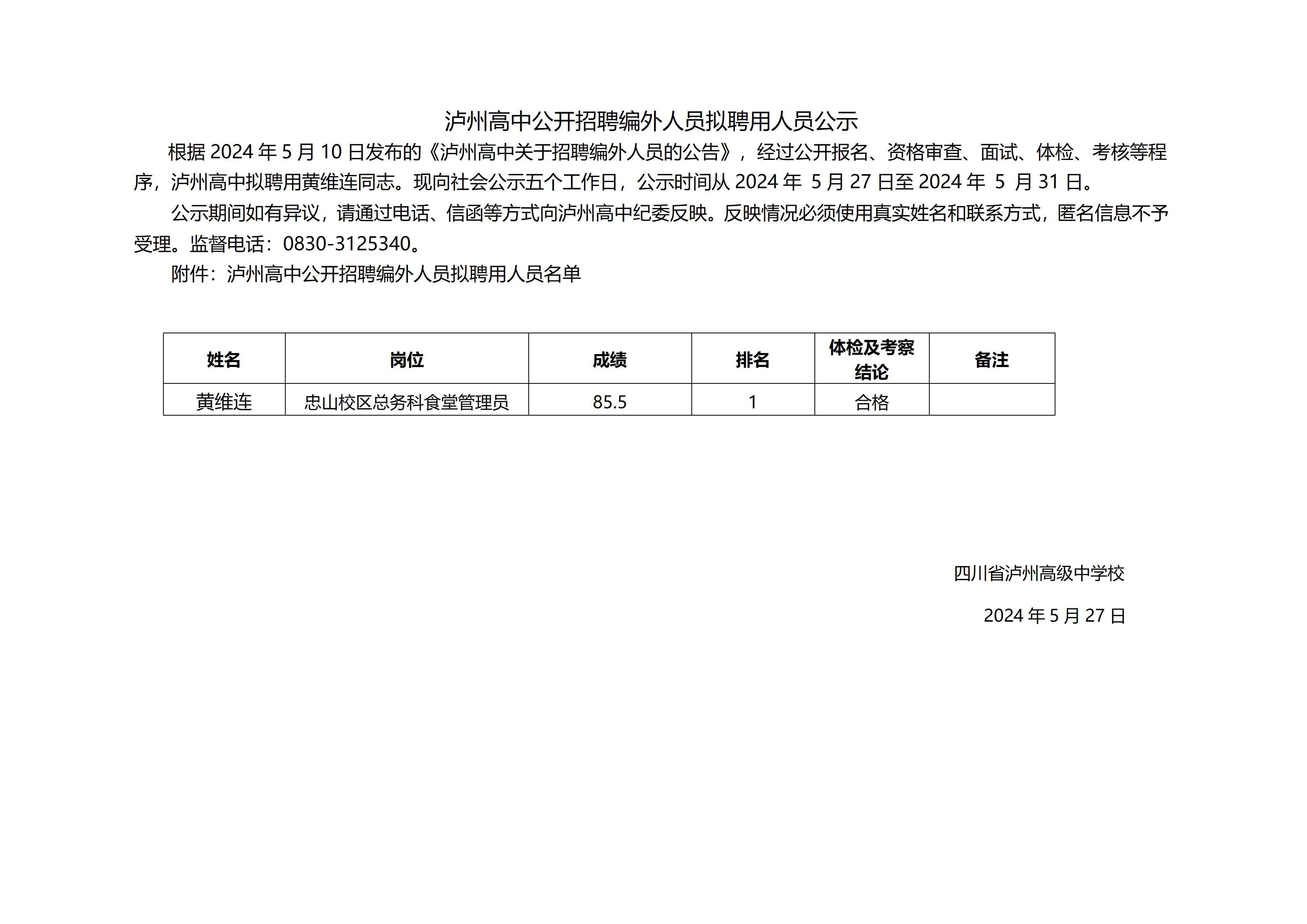 瀘州高中公開招聘編外人員擬聘用人員公示