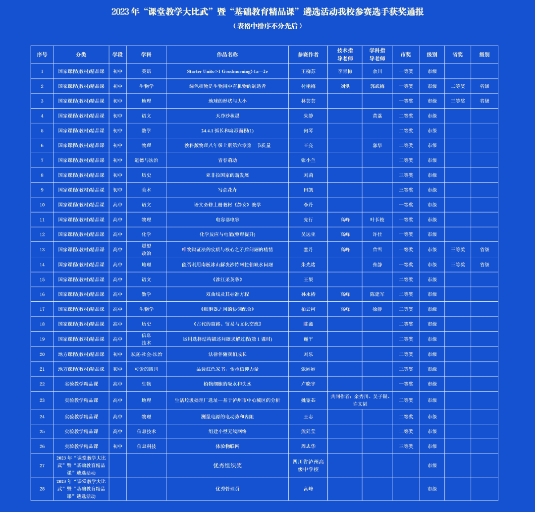 近日,在2023年“課堂教學大比武”暨“基礎教育精品課”遴選活動和2024年中小學實驗教學說課現(xiàn)場評選活動中,我校初高中教師、各學科教研組踴躍參與,付出智慧和辛勤的勞動,經(jīng)過層層評比,取得了豐碩的成果。
