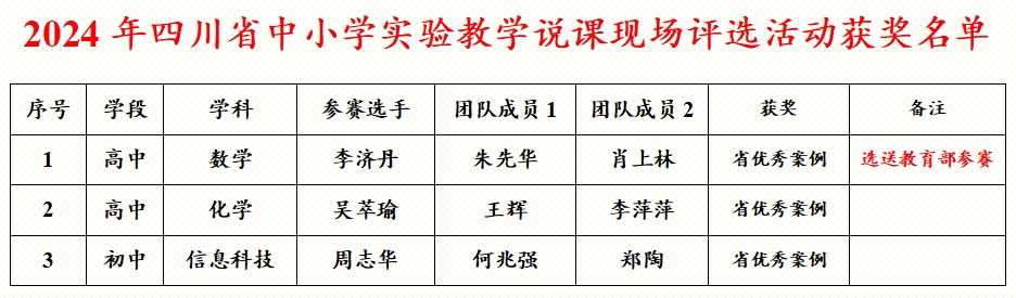 在7月12日—14日舉辦的“2024年四川省中小學實驗教學說課現(xiàn)場評選活動”中,我校三位選手及其團隊代表瀘州市參賽,全部被評為省級優(yōu)秀案例,其中高中數(shù)學李濟丹老師選送教育部參賽。
