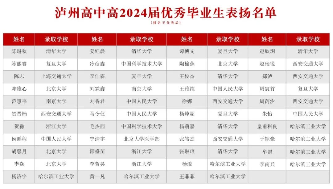 方杰宣讀了《瀘州高中關(guān)于表?yè)P(yáng)高2024屆優(yōu)秀畢業(yè)生的決定》,對(duì)陳琎秋等43名畢業(yè)生予以表?yè)P(yáng)。被表?yè)P(yáng)的43名同學(xué)政治立場(chǎng)堅(jiān)定、學(xué)業(yè)成績(jī)優(yōu)異,是德智體美勞全面發(fā)展的瀘高學(xué)子,能模范踐行瀘州高中校訓(xùn)、校風(fēng)和學(xué)風(fēng)。