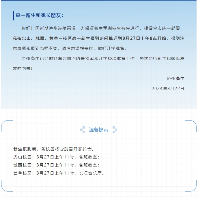 高一新生請(qǐng)注意!因高溫推遲報(bào)到