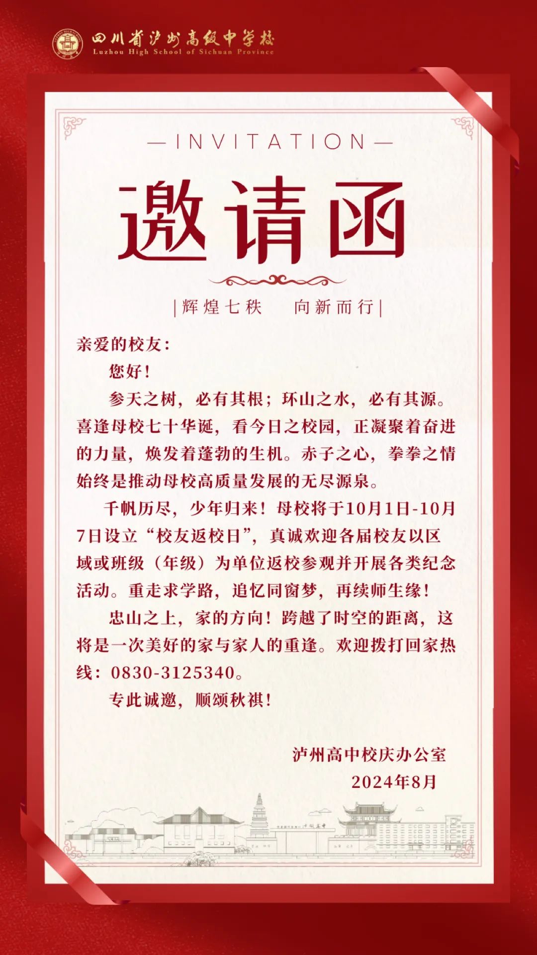 瀘州高中建校70周年校慶“校友返校日”邀請(qǐng)函
