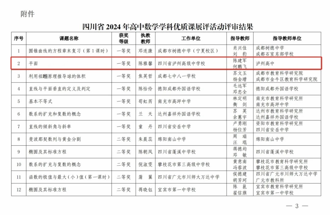 2024年10月18日,瀘州高中數(shù)學(xué)教師陳雅馨代表瀘州市參加四川省2024年高中數(shù)學(xué)課堂教學(xué)展評現(xiàn)場展示活動,勇奪一等獎,并將參加全國第十二屆高中青年數(shù)學(xué)教師課例展示活動。