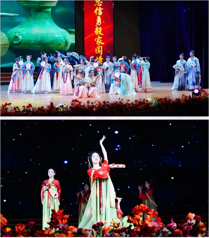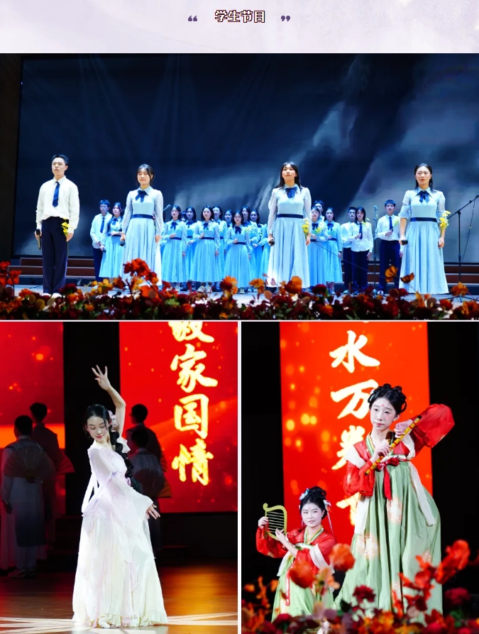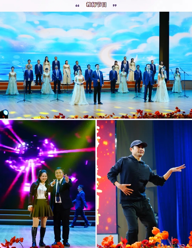 11個班級節(jié)目、2個年級組節(jié)目、1個合唱團(tuán)節(jié)目和1個教師獨(dú)舞為在場師生帶來了一場無比豐富的視聽盛宴。臺上演員們服飾考究、妝造精美、語言生動、動作豐富,形式多樣地展現(xiàn)了當(dāng)代青年學(xué)生和教師的良好精神風(fēng)貌。臺下觀眾們時而揮手互動,時而熱烈鼓掌。會場氣氛被一次次推向高潮。