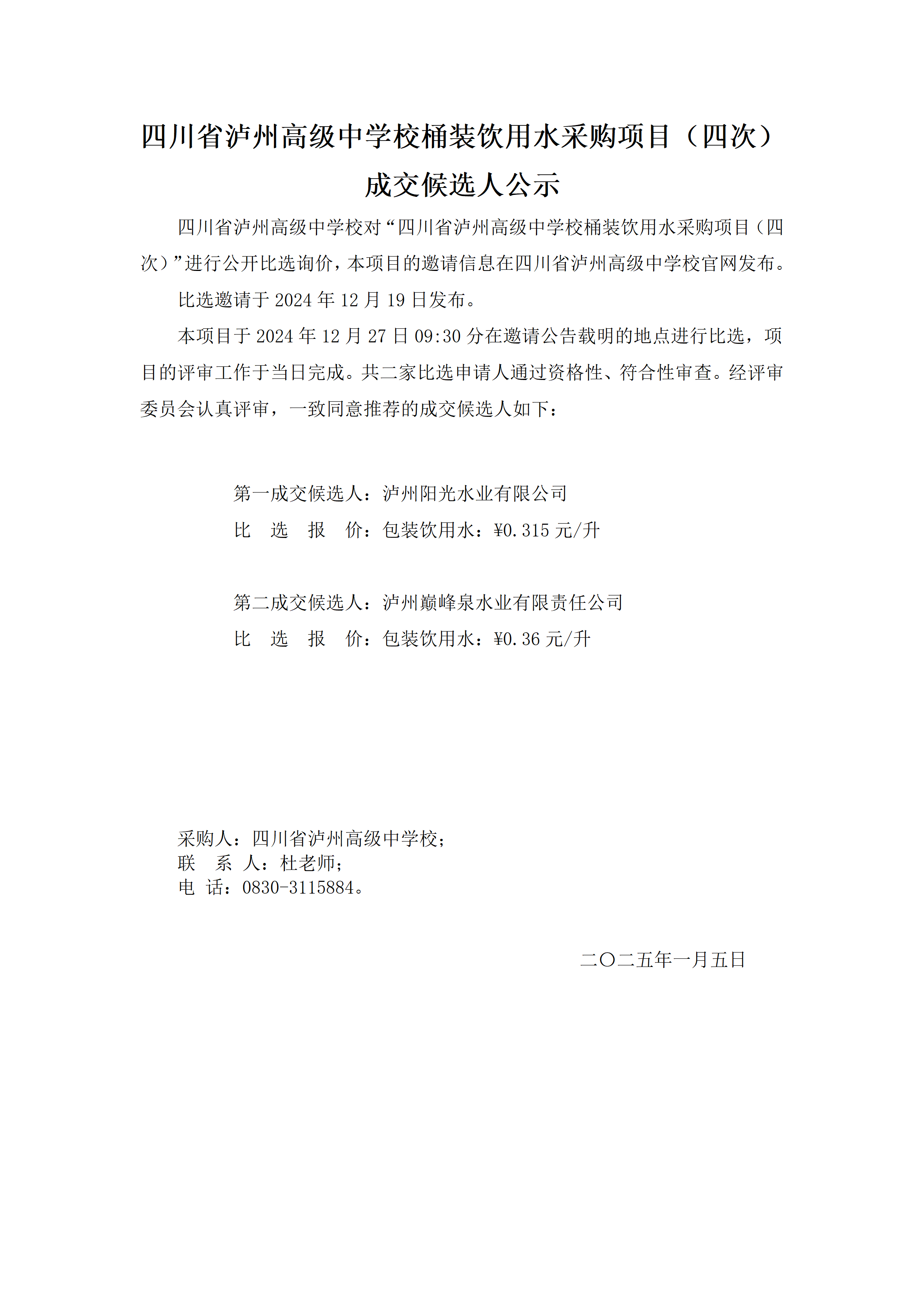 四川省瀘州高級(jí)中學(xué)校桶裝飲用水采購項(xiàng)目(四次) 成交候選人公示