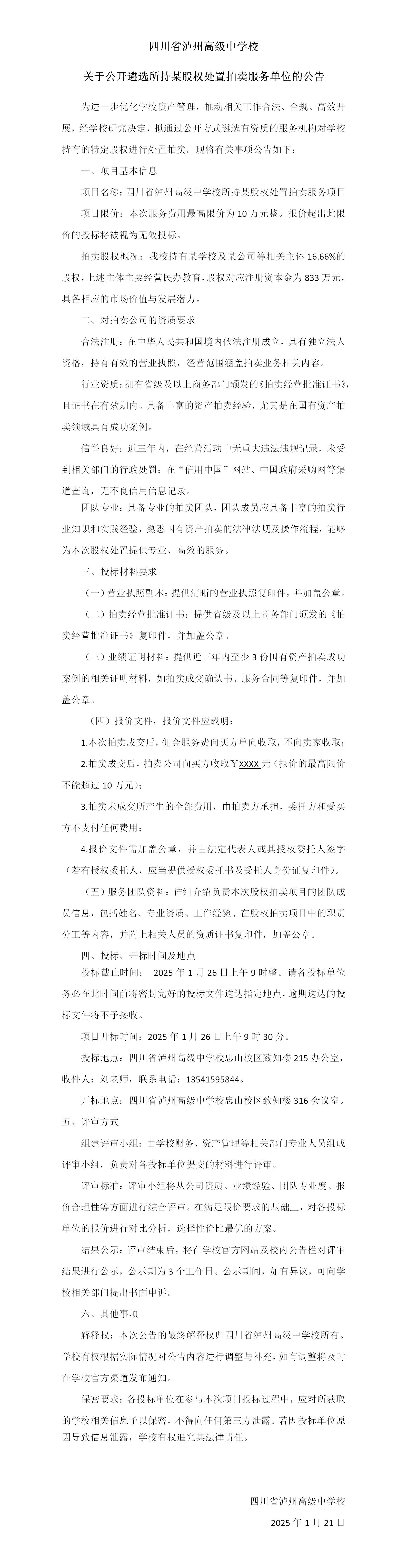 四川省瀘州高級中學校關于公開遴選所持某股權處置拍賣服務單位的公告