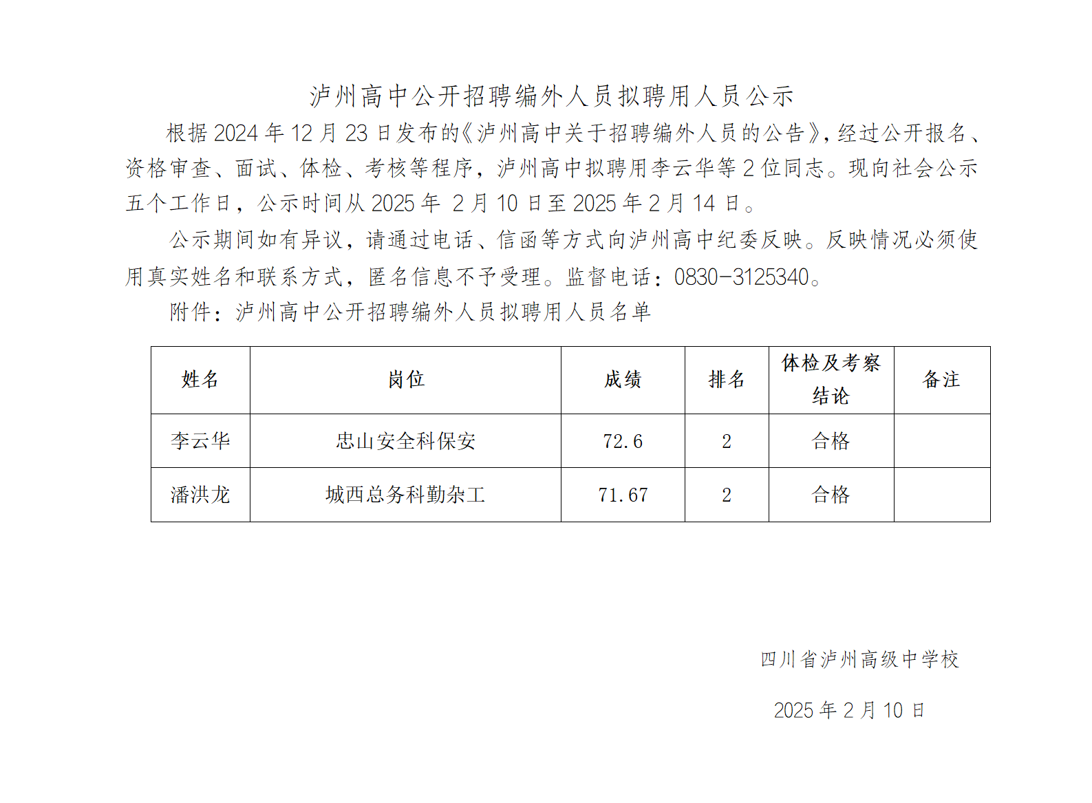 瀘州高中公開招聘編外人員擬聘用人員公示