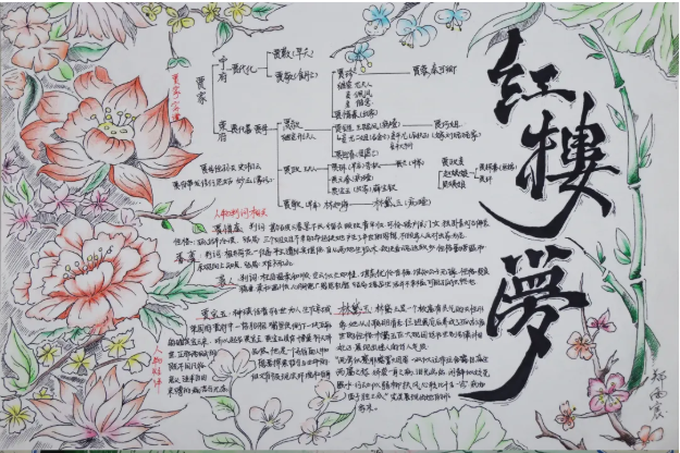 此外,在手抄報(bào)中,同學(xué)們還通過圖表清晰地梳理并繪制了《紅樓夢》中賈府主要人物的關(guān)系圖譜,并且為寧、榮兩府編纂了家譜。同學(xué)們巧妙地結(jié)合原著中的判詞,對人物性格、命運(yùn)軌跡進(jìn)行了深入剖析。林黛玉的才情與多愁善感,薛寶釵的端莊與溫婉,王熙鳳的精明與強(qiáng)干,賈寶玉的叛逆與純真……都一一躍然紙上,栩栩如生,讓人不禁感嘆同學(xué)們對人物形象的精準(zhǔn)把握。這些充滿創(chuàng)意與才情的作品,無疑為瀘州高中的校園增添了一抹亮麗的文學(xué)色彩。