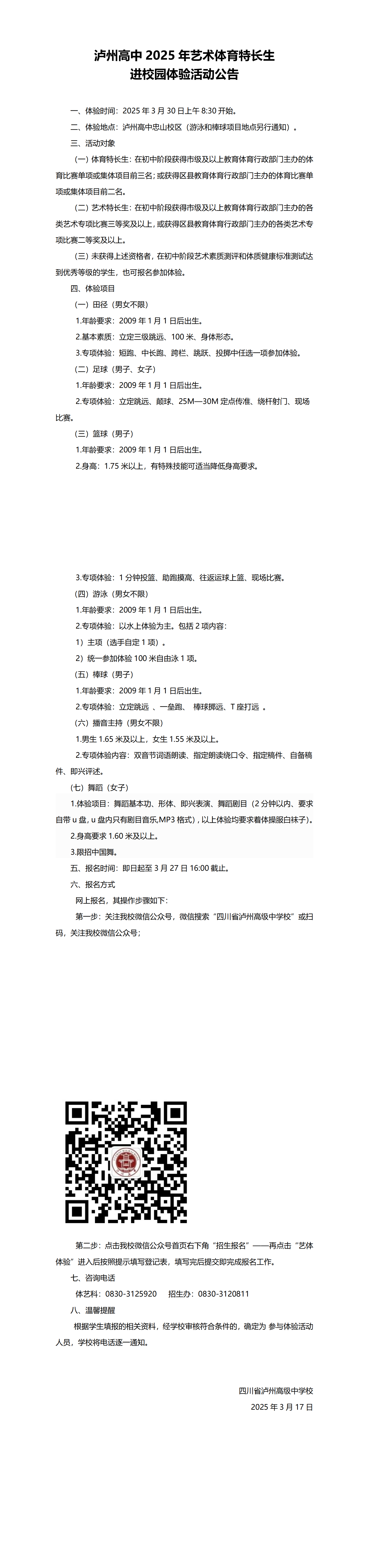 瀘州高中2025年藝術(shù)體育特長(zhǎng)生進(jìn)校園體驗(yàn)活動(dòng)公告