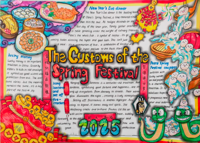 有的同學(xué)介紹了春節(jié)的由來(lái)、習(xí)俗以及慶祝方式,并配以精美的春聯(lián)、福字和鞭炮圖案,讓人感受到濃濃的節(jié)日氛圍;有的同學(xué)則聚焦中國(guó)傳統(tǒng)戲曲,列舉了經(jīng)典劇種與劇目,并用英文撰寫了對(duì)戲曲文化的理解;還有的同學(xué)描繪了中國(guó)傳統(tǒng)美食、中國(guó)山水人文等各類文化形態(tài)。