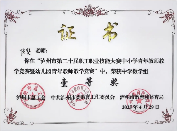 瀘州高中初中部陳龑老師,在剛剛結(jié)束的“瀘州市第二十屆職工職業(yè)技能大賽中小學(xué)青年教師教學(xué)競賽暨幼兒園青年教師教學(xué)競賽”活動中,榮獲一等獎(jiǎng)第一名!