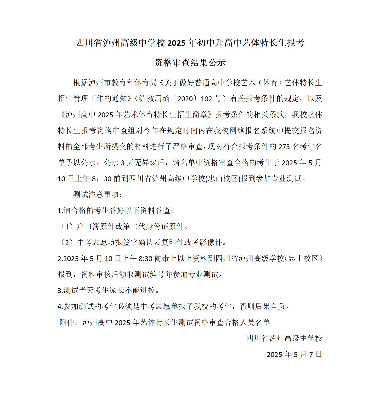 四川省瀘州高級中學校2025年初中升高中藝體特長生報考 資格審查結(jié)果公示