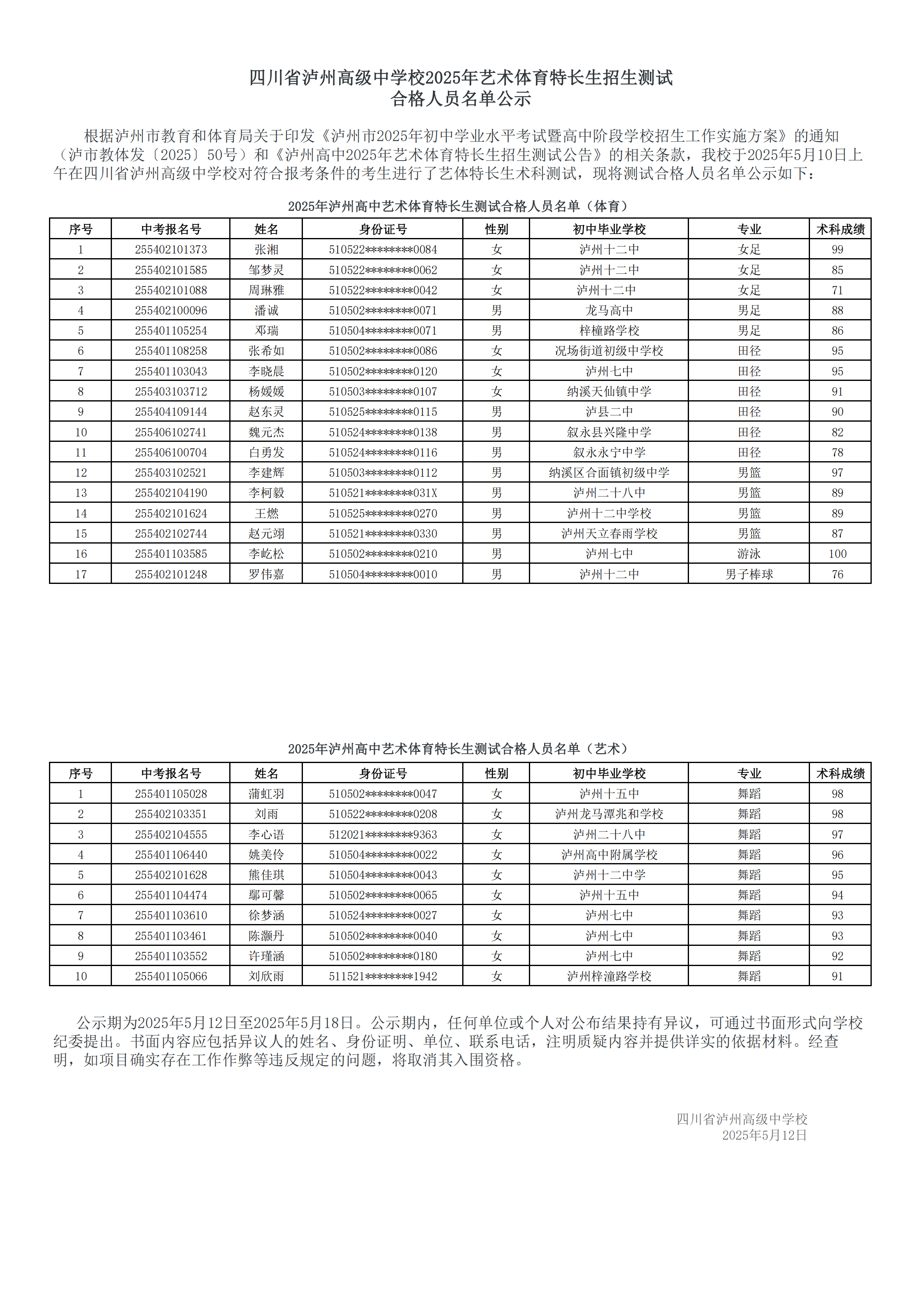 四川省瀘州高級(jí)中學(xué)校2025年藝術(shù)體育特長(zhǎng)生招生測(cè)試 合格人員名單公示