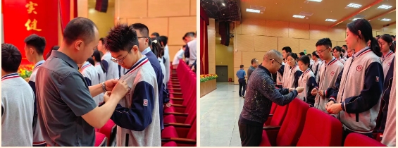 團(tuán)徽閃耀胸前,使命銘記心間。學(xué)校領(lǐng)導(dǎo)、老師為新團(tuán)員代表頒發(fā)并佩戴團(tuán)徽。