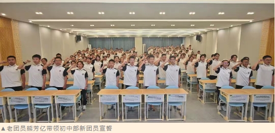 新團(tuán)員們面向團(tuán)旗、肅穆站立,右手握拳、高舉過肩,跟隨領(lǐng)誓人莊嚴(yán)宣誓。