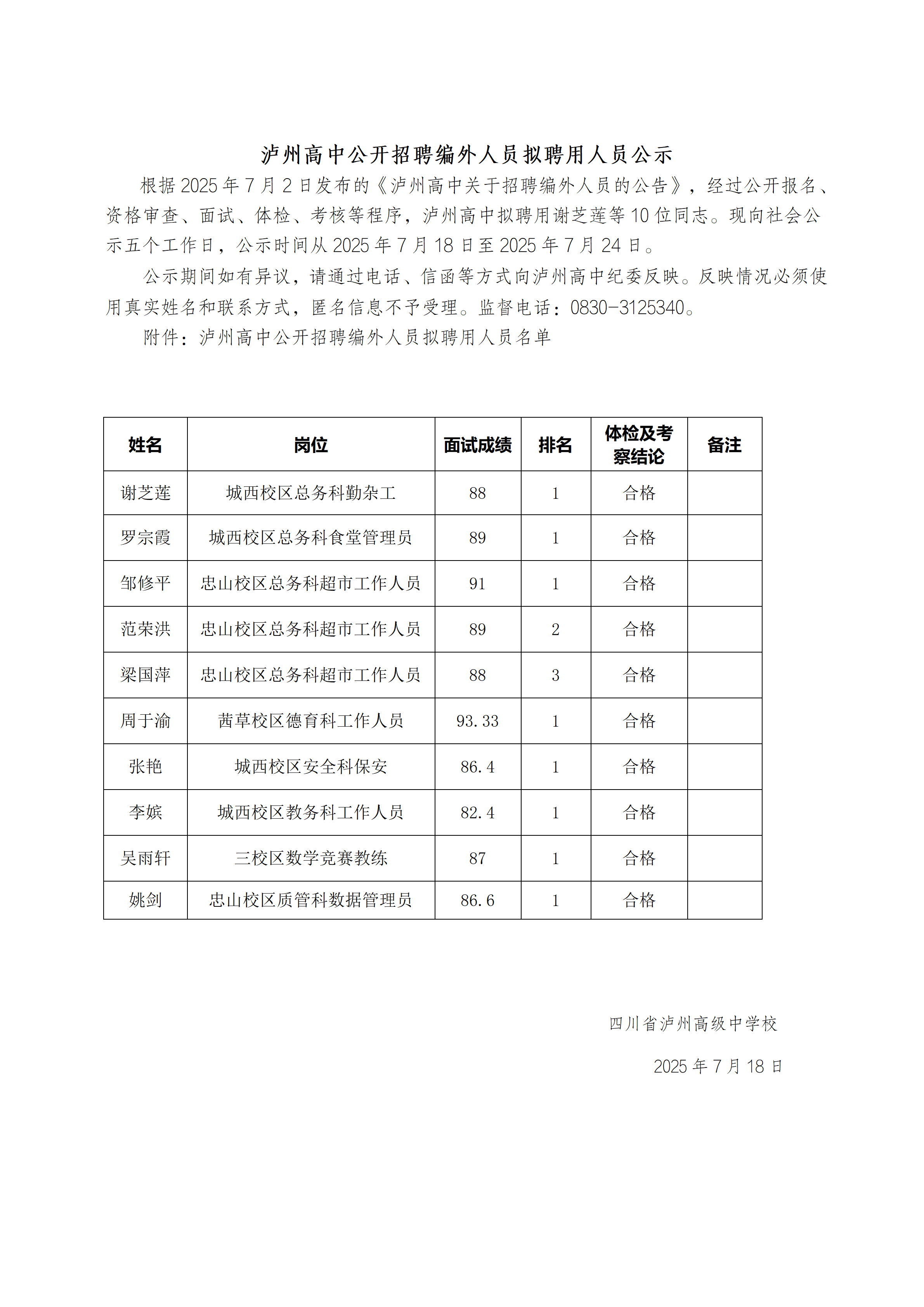 瀘州高中公開(kāi)招聘編外人員擬聘用人員公示