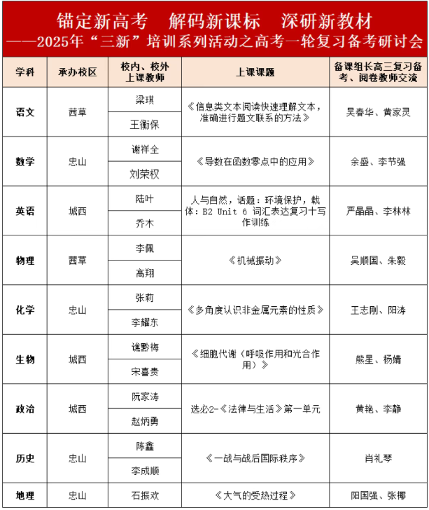“三新”導(dǎo)向,專(zhuān)家指引明方向;同課異構(gòu),教師深研育良方。為進(jìn)一步落地落實(shí)“三新”改革舉措,精準(zhǔn)把握新高考命題趨勢(shì),優(yōu)化高三一輪復(fù)習(xí)策略,主動(dòng)積極備戰(zhàn)2026年新高考,切實(shí)提升各學(xué)科教師的備考效率和課堂實(shí)踐能力,近期,教師發(fā)展中心會(huì)同各教研組開(kāi)展了主題為《錨定新高考,解碼新課標(biāo),深研新教材》的專(zhuān)題培訓(xùn)活動(dòng)。