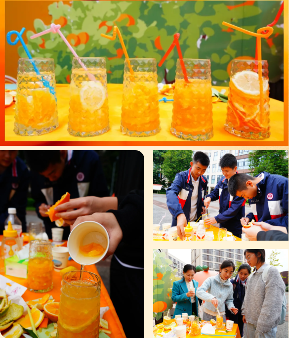 在雙馨廣場,同學(xué)們化身“美食創(chuàng)客”,專注投入蜂蜜橘子茶的制作——去皮、剝瓣、去核、沖泡,有條不紊的協(xié)作里,青澀的果實褪去生澀,與溫潤的蜂蜜交融出醇厚香氣。