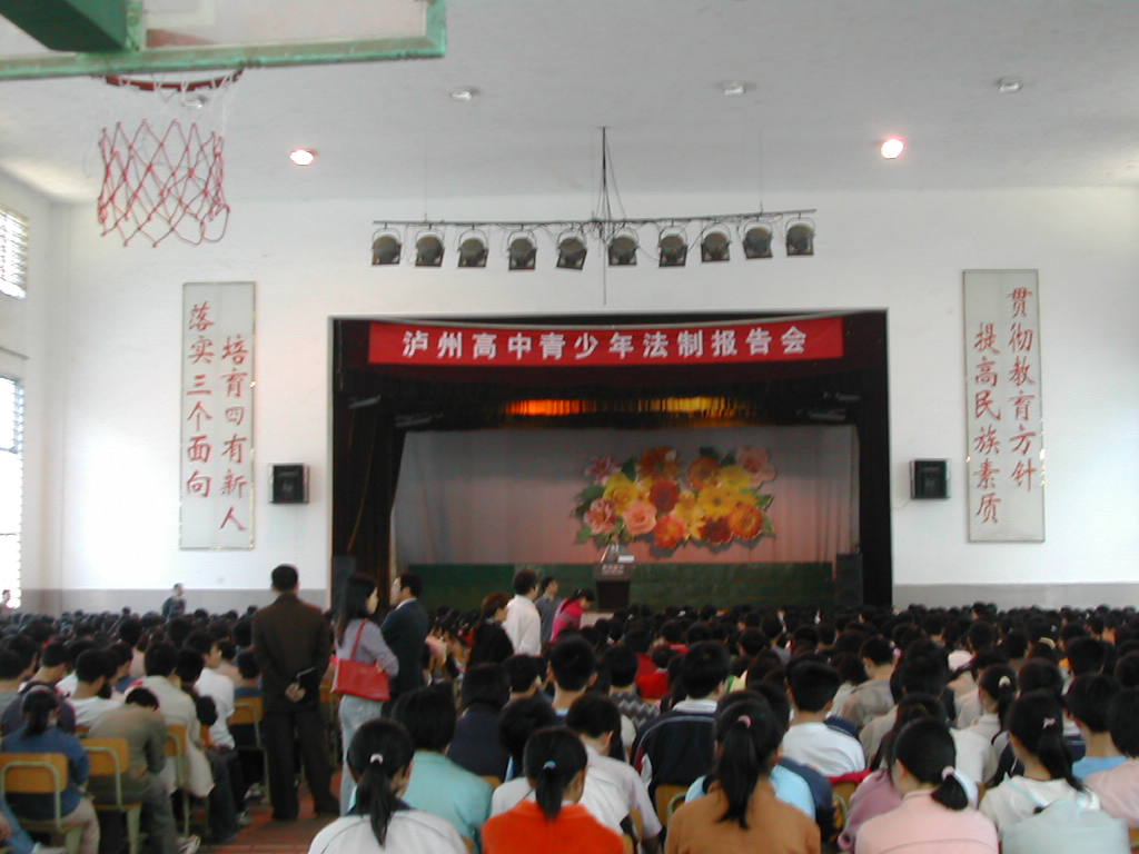 2005年4月19日下午,瀘州高中邀請(qǐng)瀘州市法建辦副主任、瀘州市普法講師團(tuán)秘書(shū)長(zhǎng)陳祖琳到校為高一年級(jí)學(xué)生作法制報(bào)告。報(bào)告的題目是《學(xué)法、守法、用法,做新世紀(jì)合格的接班人》。報(bào)告從憲法講起,輔之以五個(gè)具體案例,報(bào)告深動(dòng)活潑,迎得同學(xué)們陣陣掌聲。陳主任引用五個(gè)案例《兩個(gè)學(xué)生為了搶錢,用鐵鋃頭砸死網(wǎng)吧老板》、《校園內(nèi)成立的黑色110》、《因泡網(wǎng)吧殺死父親、奶奶事件》、《云南大學(xué)馬加爵殺人事件》、《一名少年犯的懺悔》,充分闡述了學(xué)習(xí)法律的重要意義,要求同學(xué)們?cè)谔岣邔W(xué)習(xí)成績(jī)的同時(shí),要不斷加強(qiáng)自身素質(zhì)的提高,不能忽視心理素質(zhì)的提高,思想素質(zhì)的培養(yǎng),各方面能力的提高。要加強(qiáng)法律知識(shí)的學(xué)習(xí),做一個(gè)知法、守法、用法的新世紀(jì)的合格的建設(shè)者和接班人。