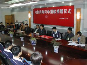 2004年11月16日下午4:30,向張同剛同學捐款捐贈儀式在瀘州高中會議室舉行。參加會議的有學校肖林校長,吳浩錫、王曉云、趙曉林三位副校長,辦公室副主任羅德強,校團委王健波、李秀芹兩位副書記,教科室副主任兼高三年級組長李龍清,高一年級組組長周渝,高二年級組組長宋永平,張同剛的班主任包夢梅、許冬青兩位老師以及20名張同剛的同學。捐贈儀式由吳浩錫副校長主持。首先,趙曉林副校長對張同剛的情況作簡要介紹: