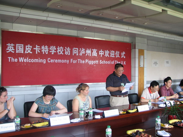 7月7日,瀘州高中舉行歡迎儀式,熱烈歡迎姊妹學(xué)校--英國(guó)皮卡特學(xué)校師生的再度來(lái)訪。瀘高肖林校長(zhǎng)致歡迎辭,皮卡特學(xué)校領(lǐng)隊(duì)凱迪女士致了答謝辭,其后雙方學(xué)生代表也發(fā)了言。