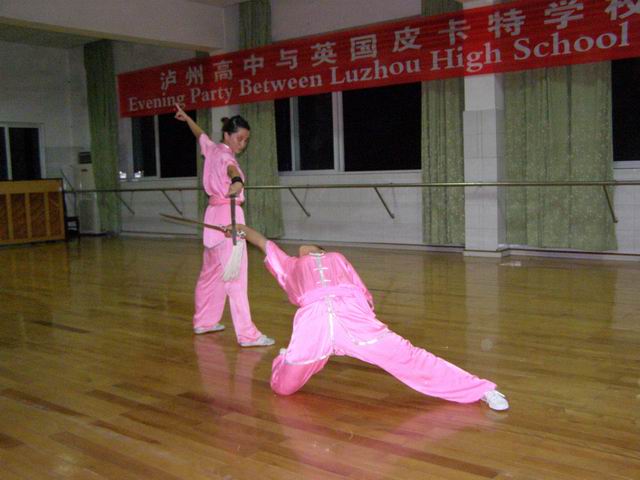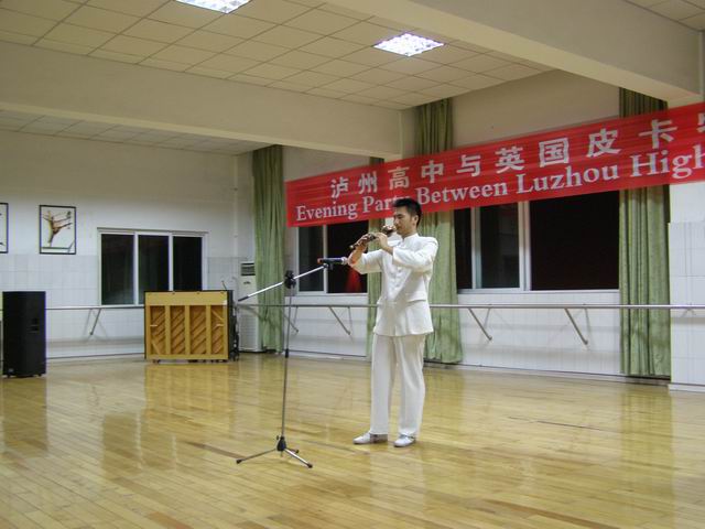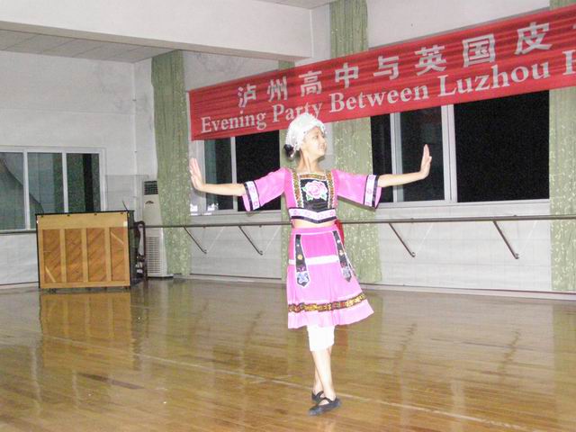 在瀘高肖林校長(zhǎng)致歡送詞、皮卡特學(xué)校領(lǐng)隊(duì)凱迪女士致答謝詞后,聯(lián)歡晚會(huì)正式拉開(kāi)序幕。瀘州高中學(xué)生表演的民樂(lè)國(guó)畫(huà)、川劇“變臉”、男聲二重唱、獨(dú)舞、葫蘆絲獨(dú)奏、校園集體舞、武術(shù)等節(jié)目,都具有專(zhuān)業(yè)水準(zhǔn),贏得了此起彼伏的掌聲和喝彩聲。特別是具有中國(guó)民族特色的川劇變臉和武術(shù),更是讓英國(guó)客人看得如癡如醉,大呼不可思議。蜚聲市內(nèi)外的瀘高學(xué)生社團(tuán)“凝神樂(lè)坊”和街舞隊(duì)也獻(xiàn)上了精彩的節(jié)目。當(dāng)街舞隊(duì)表演出高難度動(dòng)作時(shí),現(xiàn)場(chǎng)掌聲、尖叫聲不絕于耳,將晚會(huì)推向了高潮。