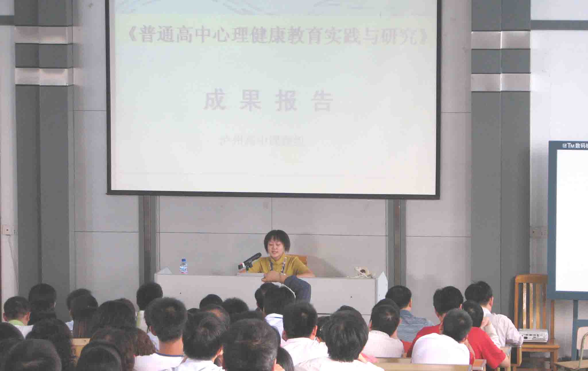 會上,有3個科研課題和7篇論文作了展示。展示時,課題主研人員和論文作者向大會作10分的成果介紹。每個成果介紹完畢,都贏來陣陣掌聲。由肖林校長、王曉榮副校長、王春艷、曾雪、楊文平老師主研的《普通高中開展心理健康教育實(shí)踐活動研究》課題獲得1.5萬元的最高獎。該課題研究從1996年開始到2004年揭題,歷時8年,曾獲得省第二屆基礎(chǔ)教育課程改革優(yōu)秀成果二等獎,市政府第三屆普教教學(xué)成果一等獎。